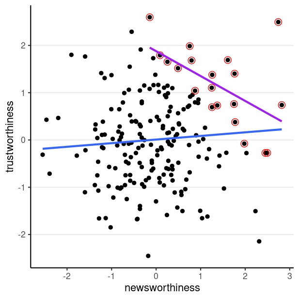 m_med <- brm( # Two equations for two outcomes bf(cong_mesg ~ tone + emo) + bf(emo ~ tone) + set_rescor(FALSE), data = framing, seed = 1338, iter = 4000, family = list(bernoulli("logit"), gaussian("identity")))># Family: MV(bernoulli, gaussian) ># Links: mu = logit># mu = identity; sigma = identity ># Formula: cong_mesg ~ tone + emo ># emo ~ tone ># Data: framing (Number of observations: 265) ># Draws: 4 chains, each with iter = 4000; warmup = 2000; thin = 1;># total post-warmup draws = 8000># ># Population-Level Effects: ># Estimate Est.Error l-95% CI u-95% CI Rhat Bulk_ESS Tail_ESS># congmesg_Intercept -2.01 0.30 -2.60 -1.42 1.00 9742 6632># emo_Intercept 3.40 0.24 2.93 3.86 1.00 10684 6756># congmesg_tone -0.15 0.29 -0.73 0.41 1.00 9449 6097># congmesg_emo 0.32 0.06 0.21 0.43 1.00 9514 6710># emo_tone 1.14 0.33 0.47 1.79 1.00 10417 5856># ># Family Specific Parameters: ># Estimate Est.Error l-95% CI u-95% CI Rhat Bulk_ESS Tail_ESS># sigma_emo 2.73 0.12 2.51 2.98 1.00 10496 6553># ># Draws were sampled using sampling(NUTS). For each parameter, Bulk_ESS># and Tail_ESS are effective sample size measures, and Rhat is the potential># scale reduction factor on split chains (at convergence, Rhat = 1).Causal effect when holding mediator at a specific level