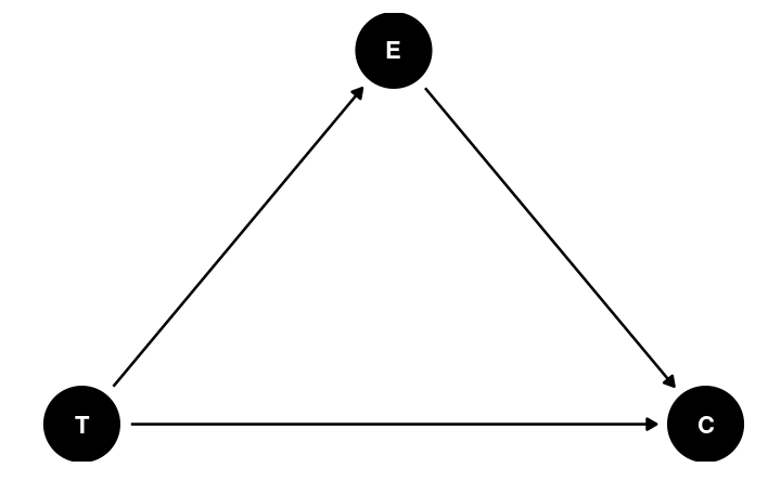 In the DAG, E is a post-treatment variable potentially influenced by T