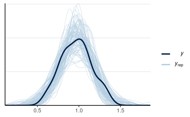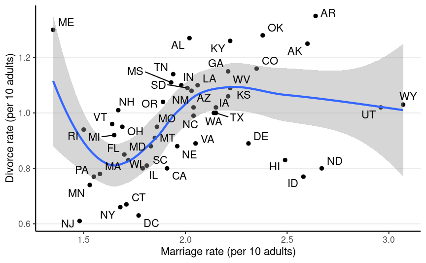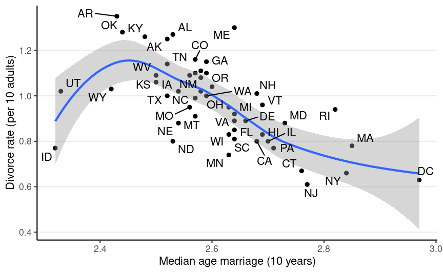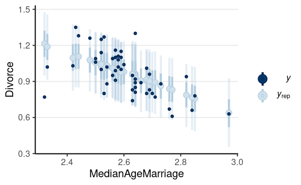 library(brms)m1 <- brm(Divorce ~ MedianAgeMarriage + Marriage, data = waffle_divorce, prior = prior(std_normal(), class = "b") + prior(normal(0, 5), class = "Intercept") + prior(student_t(4, 0, 3), class = "sigma"), seed = 941, iter = 4000)># Family: gaussian ># Links: mu = identity; sigma = identity ># Formula: Divorce ~ MedianAgeMarriage + Marriage ># Data: waffle_divorce (Number of observations: 50) ># Draws: 4 chains, each with iter = 4000; warmup = 2000; thin = 1;># total post-warmup draws = 8000># ># Population-Level Effects: ># Estimate Est.Error l-95% CI u-95% CI Rhat Bulk_ESS Tail_ESS># Intercept 3.49 0.77 1.96 4.99 1.00 5179 5008># MedianAgeMarriage -0.94 0.25 -1.42 -0.44 1.00 5605 5608># Marriage -0.04 0.08 -0.20 0.12 1.00 5198 4900># ># Family Specific Parameters: ># Estimate Est.Error l-95% CI u-95% CI Rhat Bulk_ESS Tail_ESS># sigma 0.15 0.02 0.12 0.19 1.00 6071 5326># ># Draws were sampled using sampling(NUTS). For each parameter, Bulk_ESS># and Tail_ESS are effective sample size measures, and Rhat is the potential># scale reduction factor on split chains (at convergence, Rhat = 1).